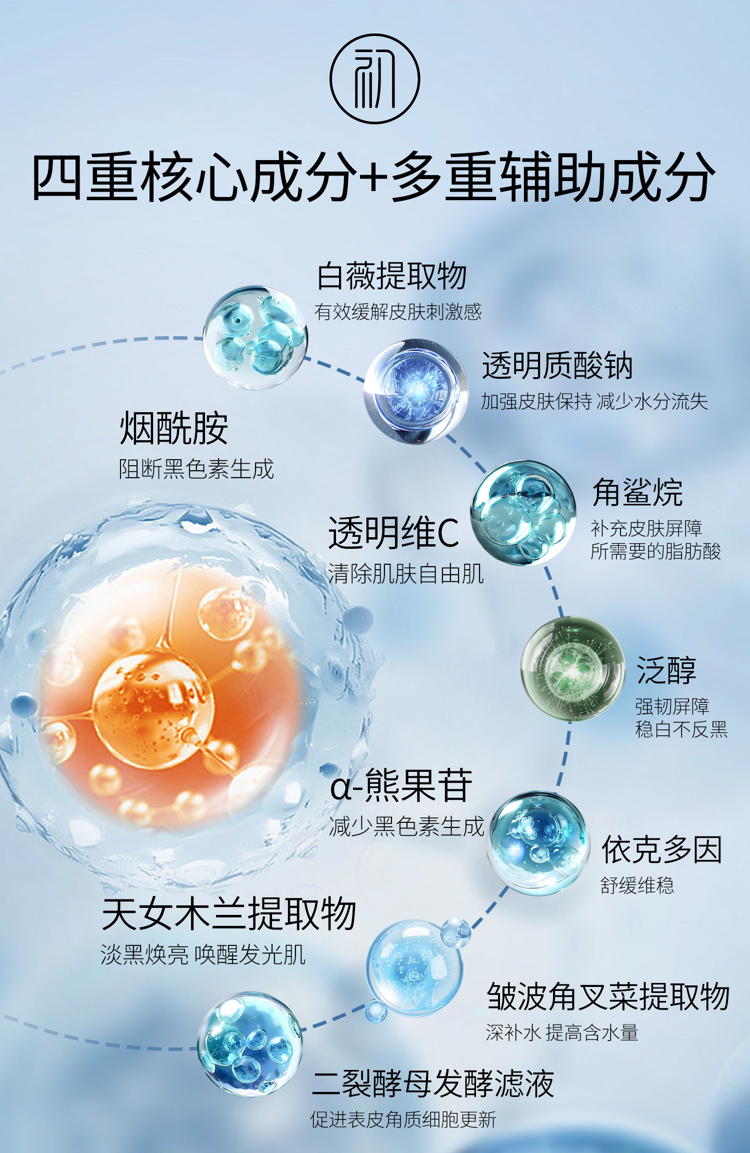 这款套装主打的“先修后白”的理念,所以使用之后不会对肌肤造成刺激感还很有效。先来看看其美白核心成分,包括了烟酰胺+α-熊果苷,既能够调节肌肤水油平衡,改善肌肤暗沉粗糙,还可以让肌肤更高效的焕白;加上天女木兰提取物+透明维C的组合可以让黑色素无处可藏,它们共同从黑色素源头阻止其再生,净化顽固色斑,让肌肤焕白更持久。